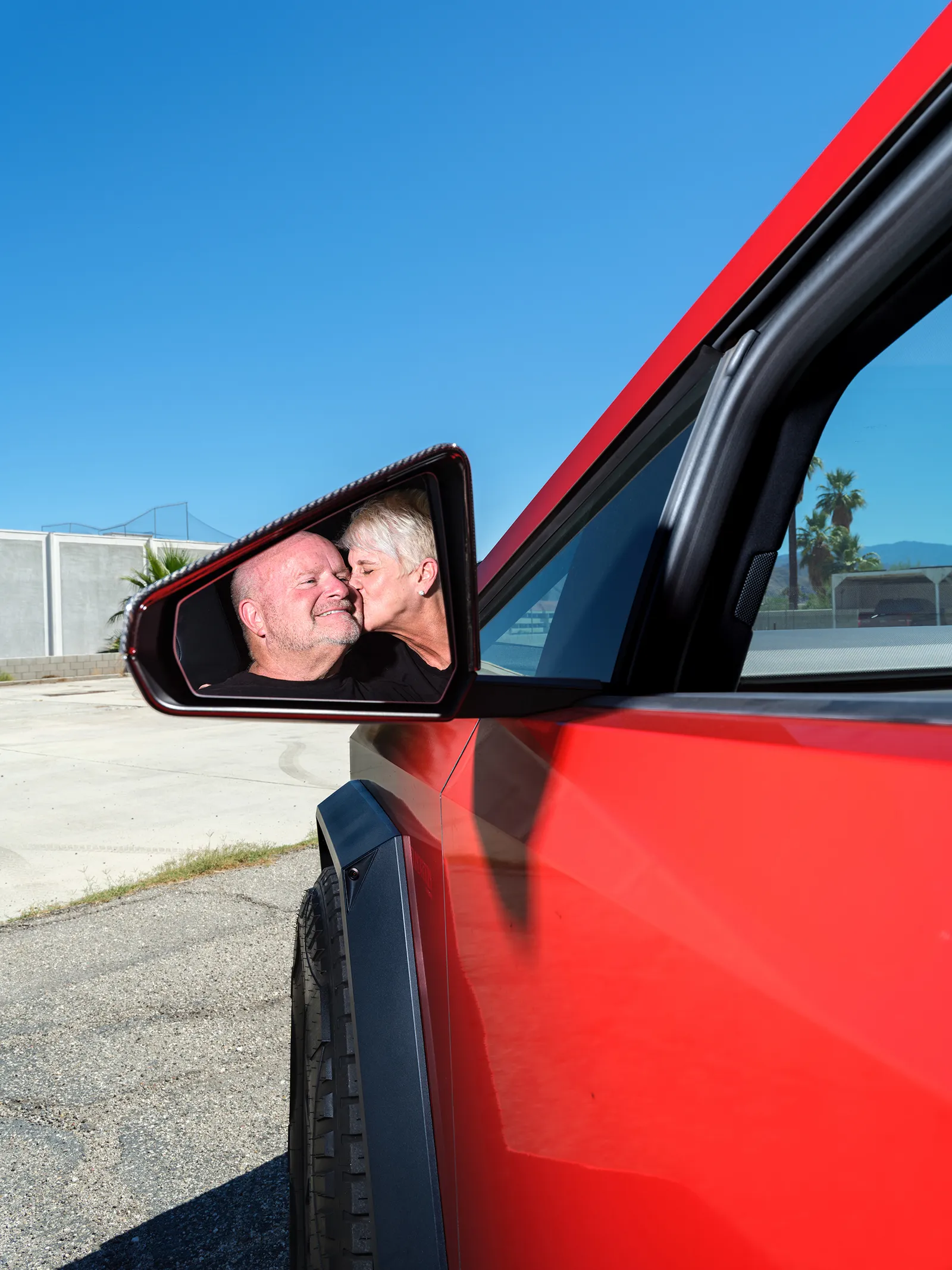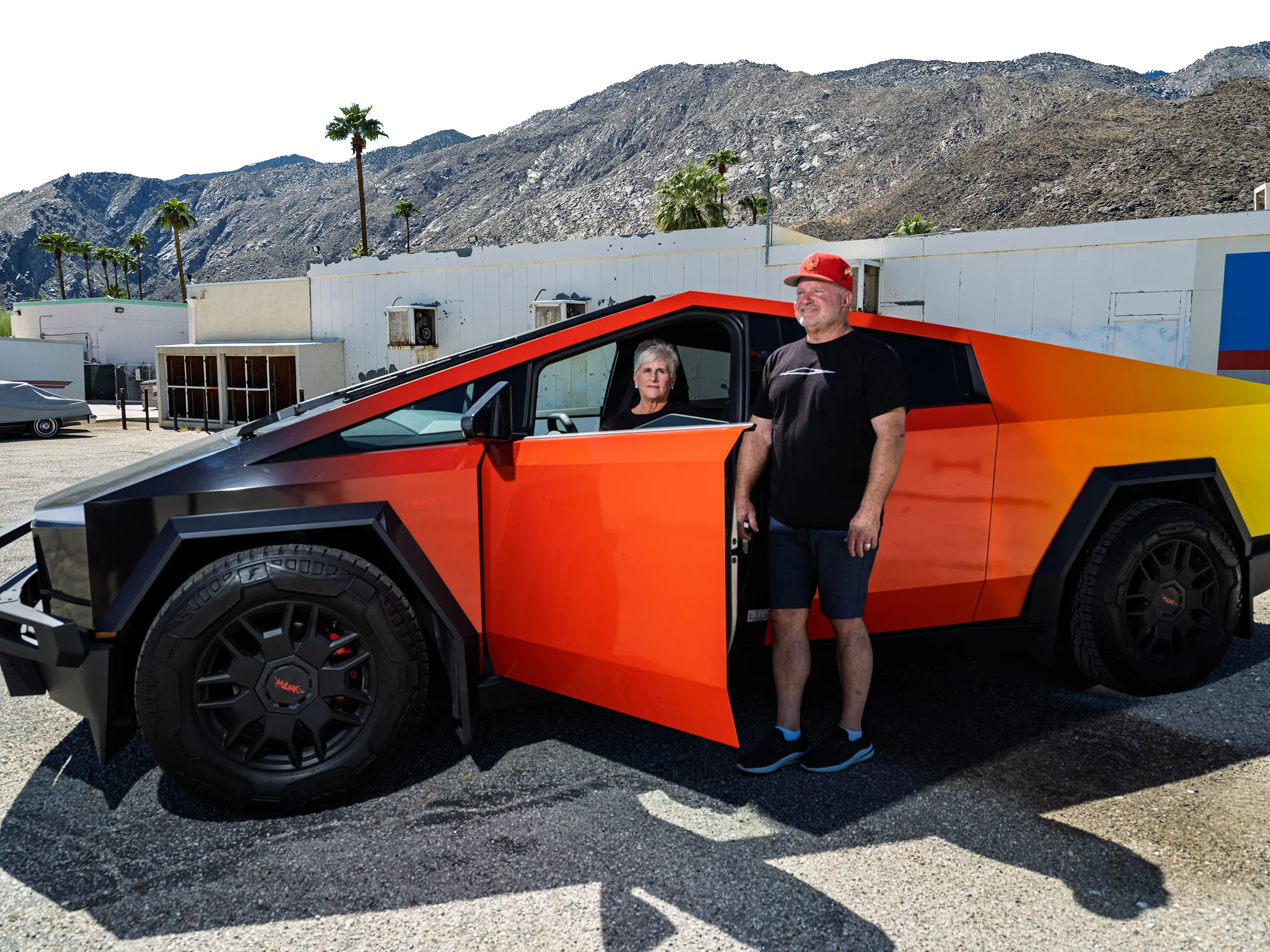 We're standing in the parking lot of McCormick's Palm Springs Classic Car Auctions. All around us, a dozen Cybertruck owners—and their cars—bake in the 100 degree heat. They've arrived for a meetup organized by Michael Goldman, who runs the 53,000-person Facebook group Cybertruck Owners Only.